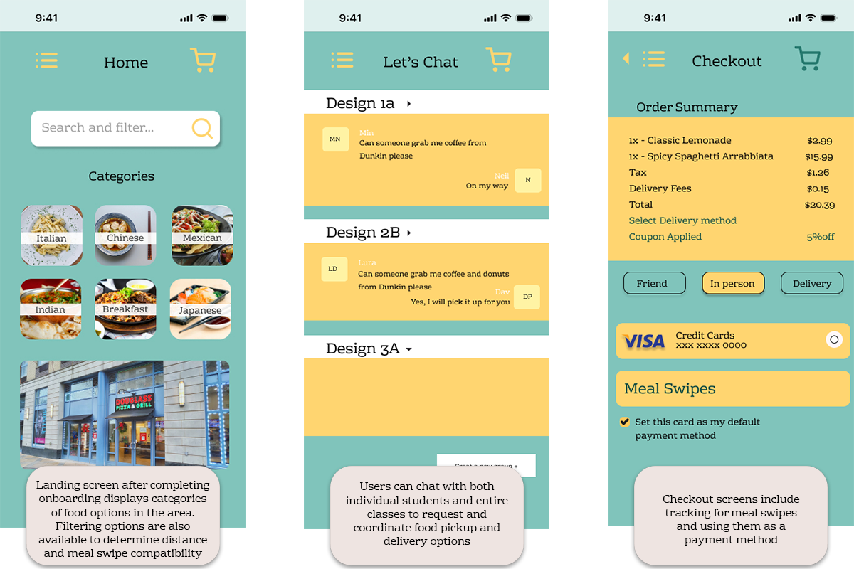 During informal testing with peers, students reported that the app’s design made it significantly easier to identify nearby options quickly and get up-to-date information on all types of food located around CSB, pricing, and meal swipe compatibility.
