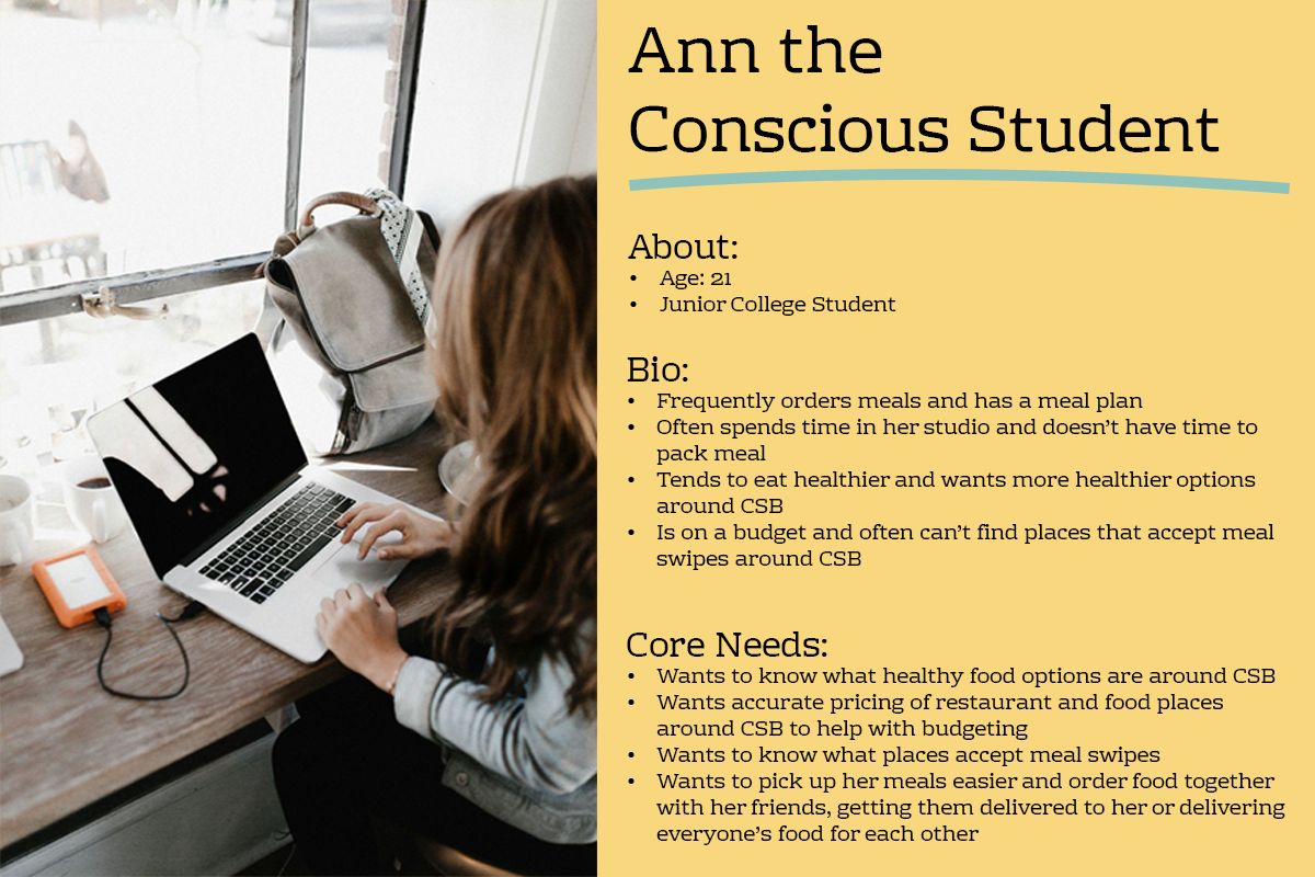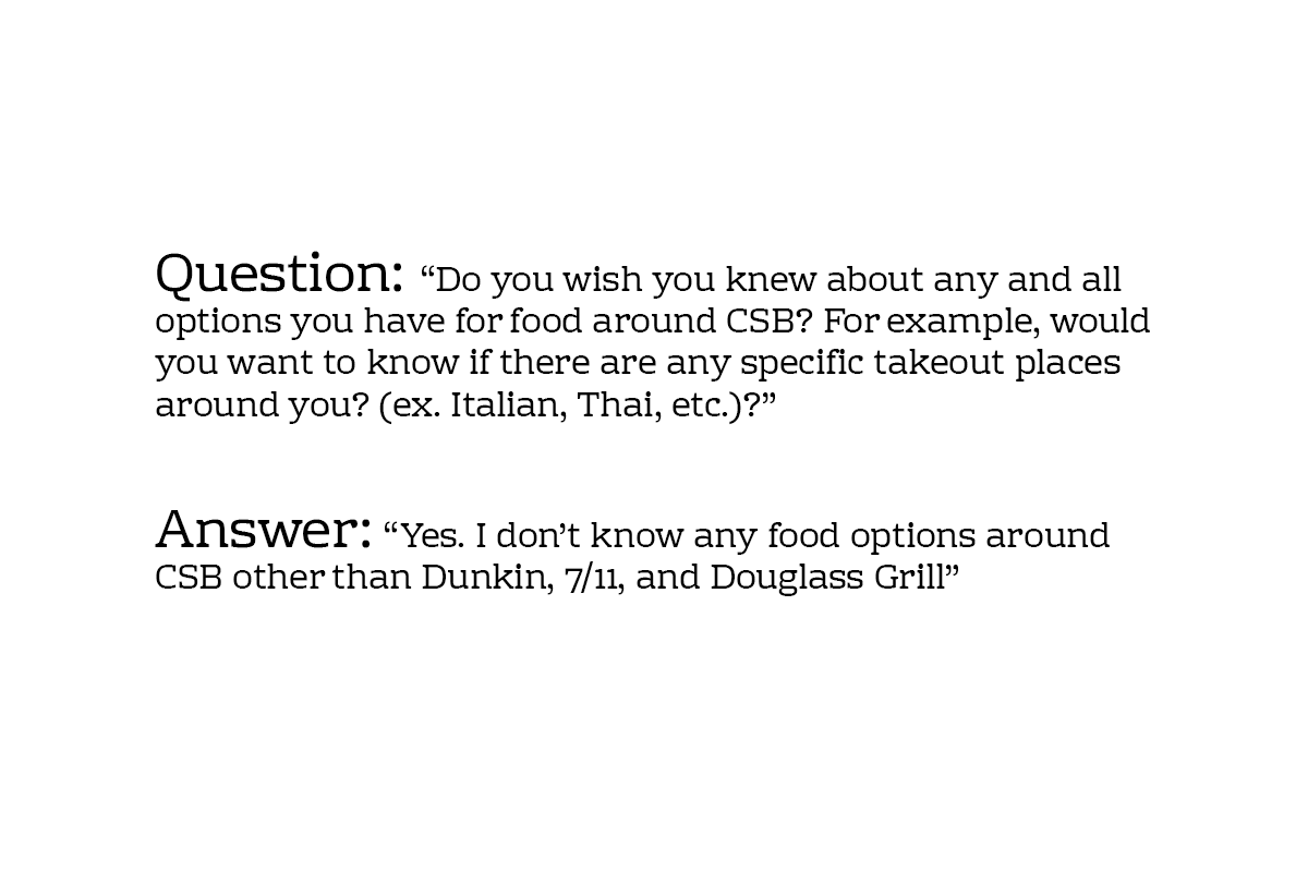 Our team conducted in-person interviews with students who attended classes at CSB and sent out an online survey distributed via a QR code on flyers to get a general consensus surrounding opinions on the food options near CSB and different ways they acquire food.