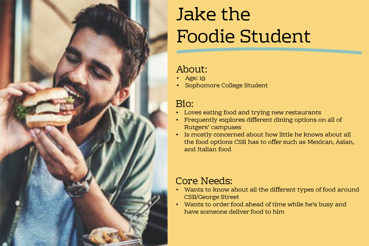 Problem: Many students attending classes at the Civic Square Building (CSB) of Rutgers University in downtown New Brunswick have little to no time to order food for lunch and don’t fully know what all of their food options are in the surrounding area, including which restaurants accept meal swipes.
